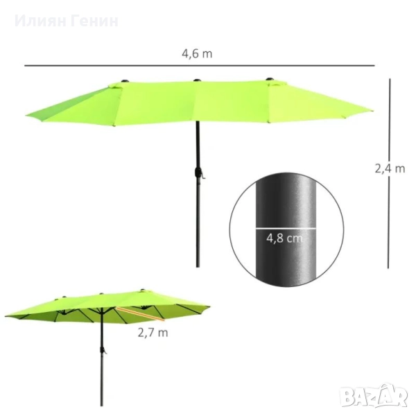 ДАННИ: Общи размери: Д460 x Ш270 x В240 см, размери на страничен чадър: Ø2,7 м, тегло: 12,5 кг. Забележка: Стойката за чадър не е включена.