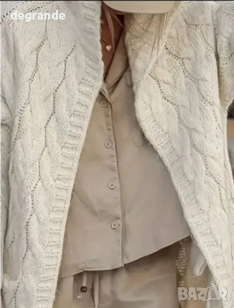 дамска бяла /екрю/ жилетка с плетеници, реглан ръкав и качулка