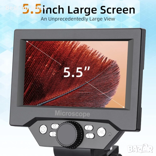 5,5-инчов екран и свързан към компютър микроскоп: Монетен микроскоп, оборудван с 5,5-инчов HD LCD екран, който осигурява добър изглед за лесно наблюдение. 1-1000x непрекъснато увеличение, захранван от акумулаторна литиево-йонна батерия или USB.