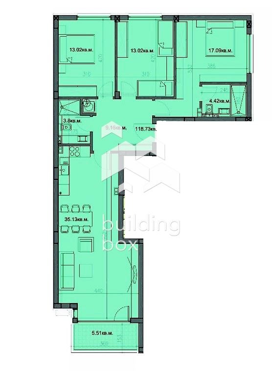 РАЗПРЕДЕЛЕНИЕ: Просторна дневна с кухненски бокс, две детски стаи по 13.02 кв.м., родителска спалня- 17.09 кв.м., две мокри помещения, входно антре и южна тераса. Към апартамента има прилежащо избено помещение - 2.01 кв.м., както и 61 кв.м. земя от поземления имот, върху който е построена сградата.