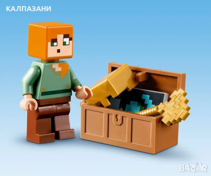 - Играчки за екшън герои – включва минифигури на Алекс и ковач на оръжия от Minecraft®, 3 среди за конструиране и броня и оръжия от Minecraft, включително златна брадва, 2 меча, 2 щита и омагьосан тризъбец