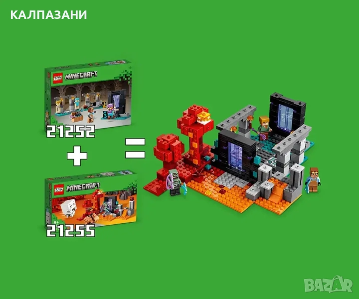- Играчка за построяване от 3 части за деца – включва работно място с наковалня, пещ, точилен камък и казан, стая за показване на броните със сандък с оръжие и портал към Ада от Minecraft® с летящи врати