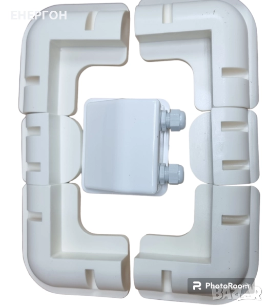 Комлектът се състои от 4 броя монтажни ъгли, 2бр средни опори + 1 бр КОНЗОЛА за покрив