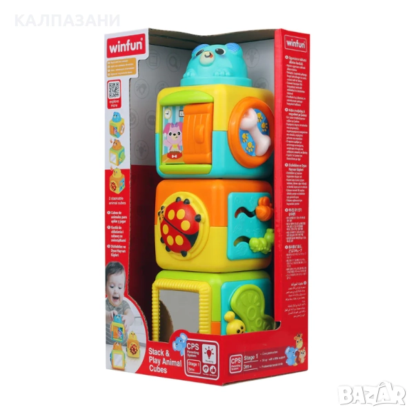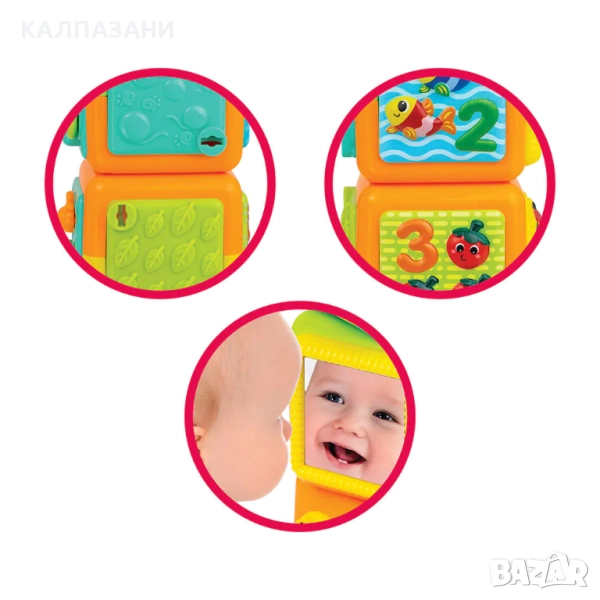Всяко кубче комбинира ярки цветове, сладки животни и интерактивни елементи като плъзгащи се прозорци, огледалца и бутони, които стимулират въображението и любопитството на бебето. Разнообразните текстури подпомагат сетивното развитие, а подвижните елементи насърчават координацията и фината моторика.