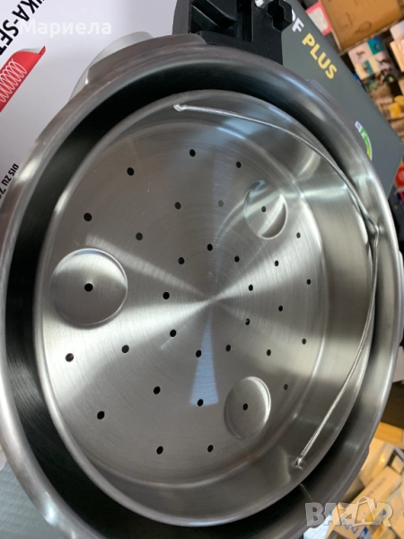 Има решетка за готвене на пара и поставка за решетката .