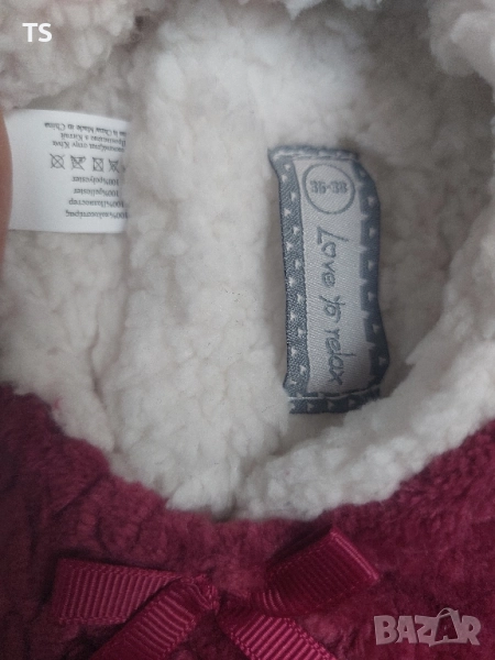 Дамски пантофки в цикламен цвят с панделка, изключително топли подходящи за зимата. Състав - 100% полиестер, производство Китай. Размерът е 35-38. Нови без етикет.