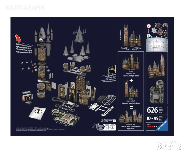 Тази превъзходна 3D репродукция на замъка Хогуортс е съставена от 540 номерирани пластмасови части от пъзел, както и уникални аксесоари за завършване на сградата. Качеството на рязане на частите - плоски, извити или сгъваеми - осигурява перфектна стабилност, всичко без лепило. Обект, който е едновременно декоративен и функционален! Вече се предлага и в светеща версия! Лесна за сглобяване, тази превъзходна 3D репродукция на емблематичния замък Хогуортс ще зарадва малки и големи, от 10-годишна възраст! Следвайте стъпките на Хари Потър, Хърмаяни Грейнджър и Рон Уизли, оставете се да бъдете отнесени в очарователния свят на Джоан Роулинг. Оригиналният предмет за украса на вашия интериор и нещо повече, сградата свети!