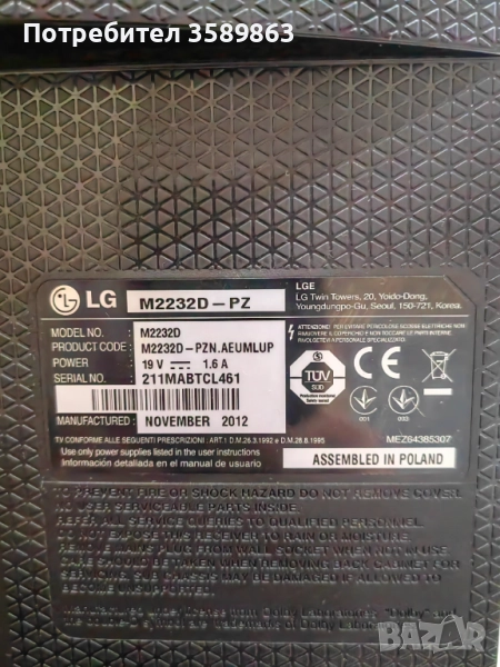 LG телевизор с LCD екран и размер до 21 инча. Не работи, преди време изгоря, дадох го на маистор направи го и сега две години по късно пак изгоря, ако на някой му се занимава може да си го направи дисплея е здрав.