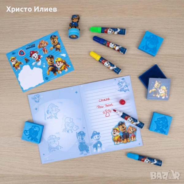Кутията съдържа пет ярко оцветени флумастери, лист със стикери със забавни мотиви от Paw Patrol и книжка за оцветяване, която да вдъхнови за оцветяване и творчество. Освен това, печат с 2D фигурка, три големи печата с любими герои и съответстваща подложка с мастило осигуряват допълнително забавление при творчеството.