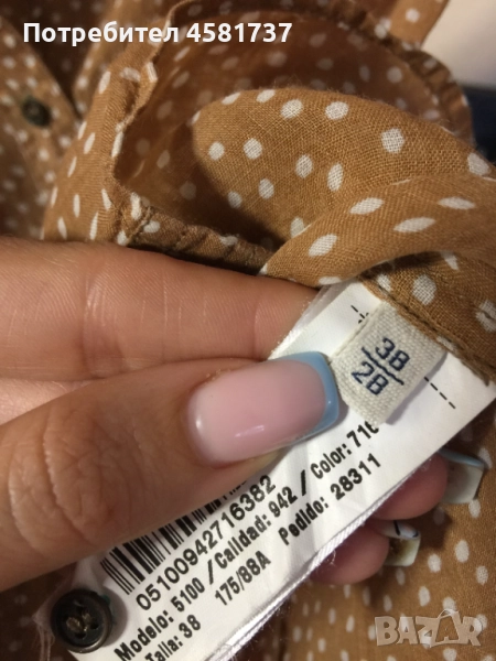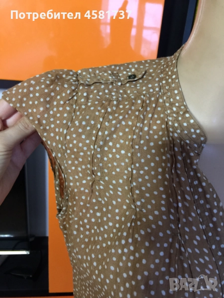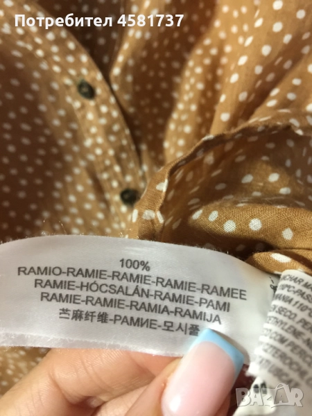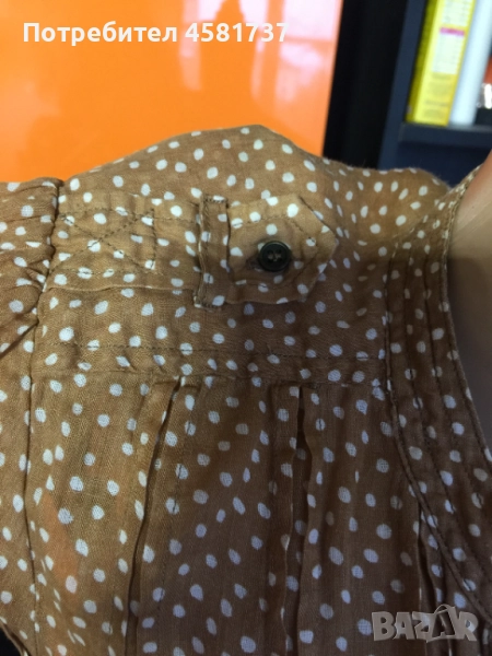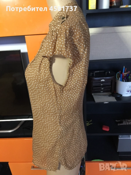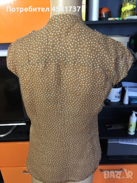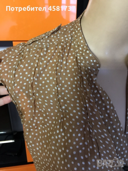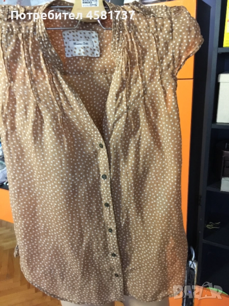 Стилна, елегантна риза на Massimo Dutti. Непреходен десен на точки- кафяв фон на бели точки. Ефектни набирания, тръгващи от раменете, попска яка, деликатно деколте, малки копчета. С малки странични цепки, красиво оформени ръкави. Материята е рамие- една от най-здравите и устойчиви материи. Естествена като памука, но с много по-високо качесво. Поради високата цена на тъканта, дрехи с рамие в състава си рядко се срещат, както при нас така и във всички магазини.