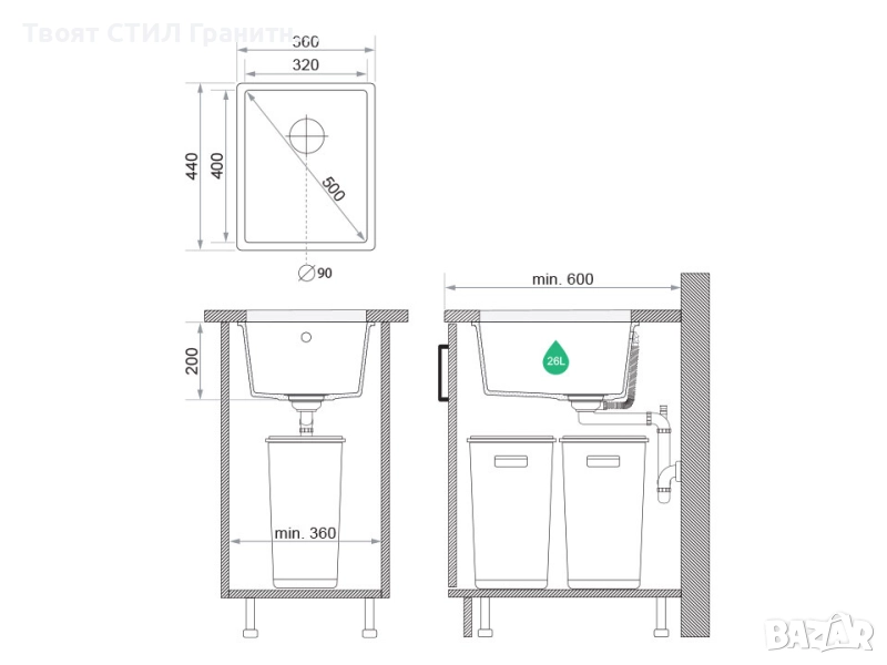 Продуктовите снимки показват предложената инсталация със сифони Твоят Стил. Преливникът и цедката, които се виждат на графиката, не са елементи от мивката и се продават отделно. За правилното монтиране на мивката е необходим персонализиран сифон с вертикален преливник.