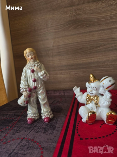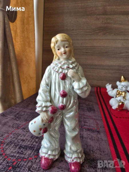 Порцеланова фигура на момиче клоун. Високо 20 см. няма маркировка. Цена 45 лева. Без забележки. Белият клоун е без маркировки липсват няколко камъчета висок 15 см. - цена 35 лева