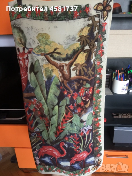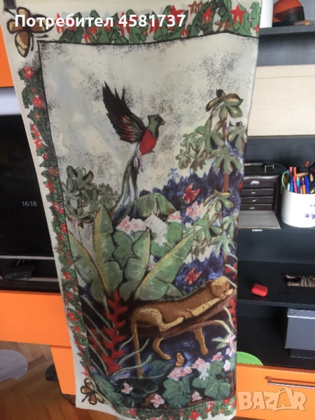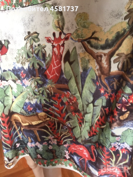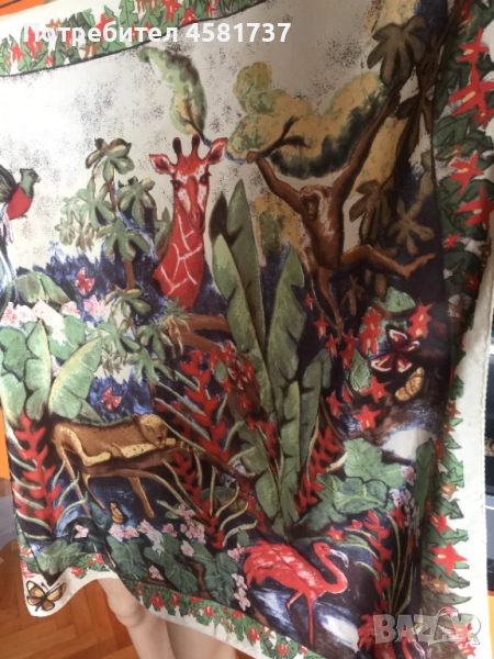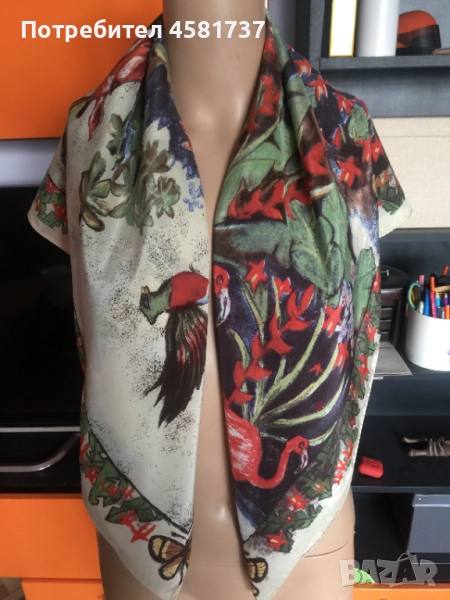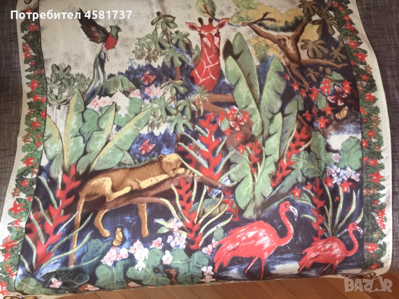 Копринен шал на немския бранд Codello, специализиран в производството на шалове. Десенът е екзотичен и носи много настроение-изобразява джунглата и нейните обитатели. Свежи цветове, красива, нежна материя. Коприната е плътна и гали тялото.