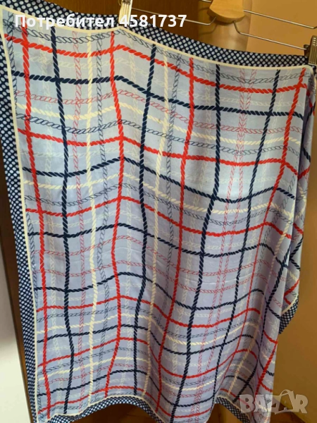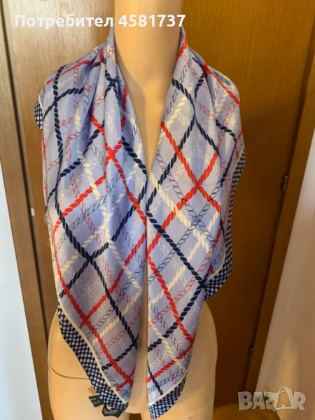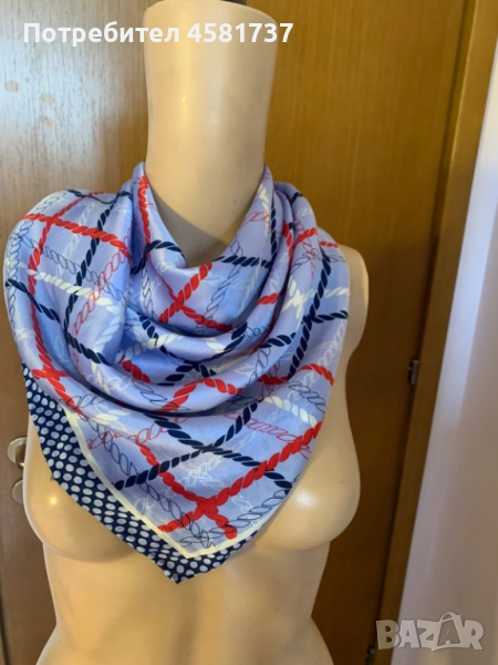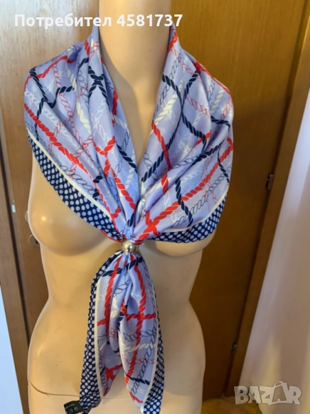Красив копринен шал в яхтен стил. В тъмносиньо, червено и светлосиньо, а кантовете са в непреходен десен на точки. Отлично се откроява на тъмносиня дреха- сако или рокля, като създава настроение за лято, почивка, яхта, море.