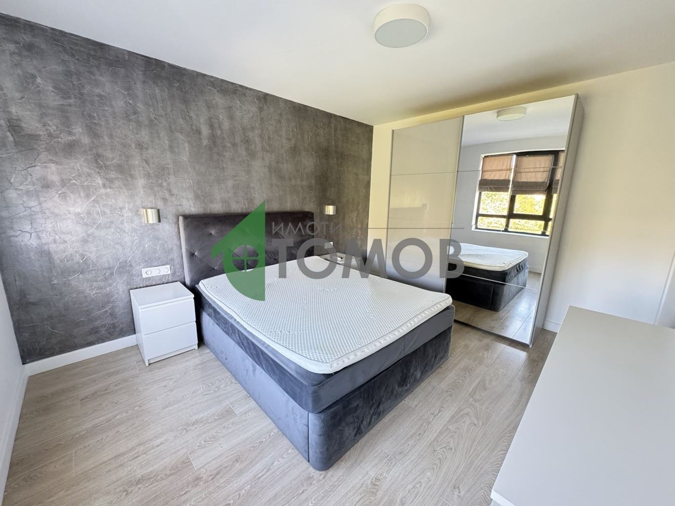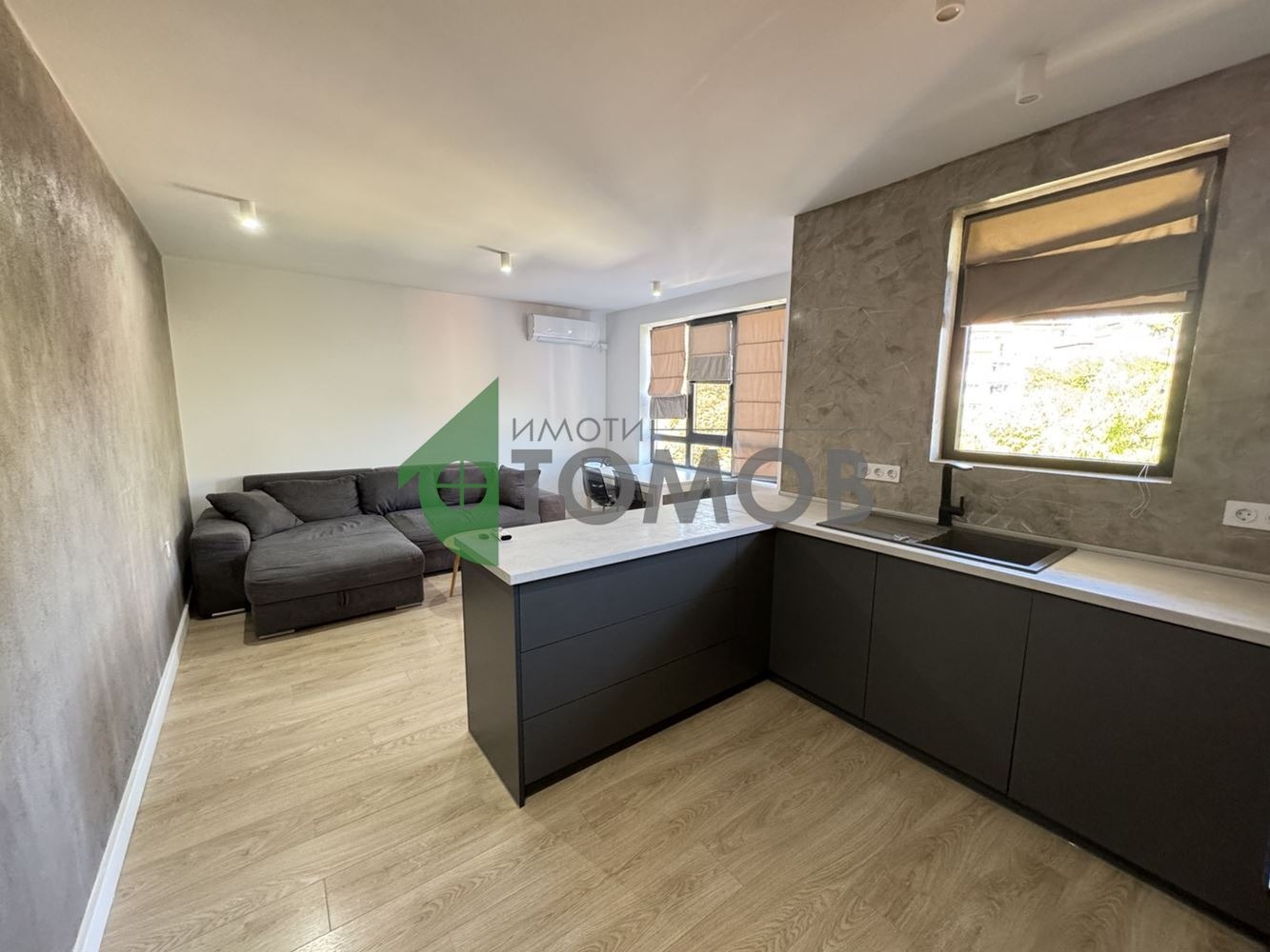 Жилището е завършено до ключ със следните подобрения: подови настилки ламиниран паркет и гранитогрес; шпакловани и боядисани стени; немска дограма с троен стъклопакет; напълно завършено санитарно помещение; напълно завършена кухня с ел. уреди хладилник, котлони, фурна, аспиратор; климатици в дневната и спалнята, поставени входни и интериорни врати; осветителни тела. Обзаведена спалня с гардероб, легло, нощни шкафчета.