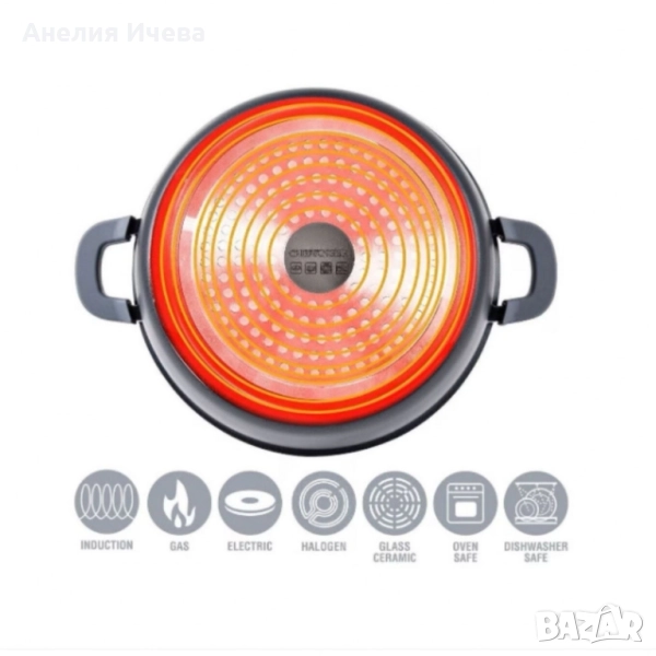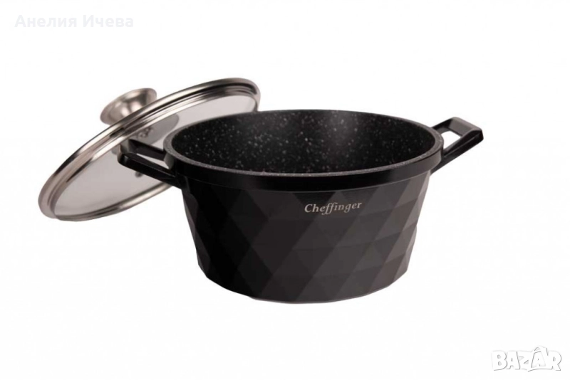 Размери диаметър: ø20-24-28 см.; Ляти под налягане, индукционни, с форма на диамант; Материал вътрешност: Мрамор; Материал капак: Стъкло; Подходящи за съдомиялна машина; Цвят: Черен, розов, червен.