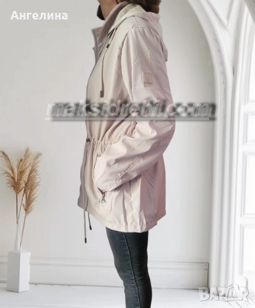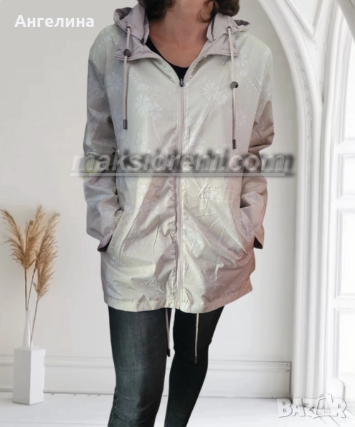 Елегантно дамско връхно яке тип шлифер с модерна дължина до средата на бедрото. Моделът е двулицев – може да се носи от едната страна в изчистен бежов цвят, а от другата – в стилен десен на бежова основа с бели цветя. Якето разполага със сваляща се качулка с цип, практични джобове и регулируеми ръкави с маншет. Талията се стяга с връзка за подчертаване на силуета. Леката и удобна материя го прави подходящо за пролетно-есенния сезон.