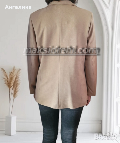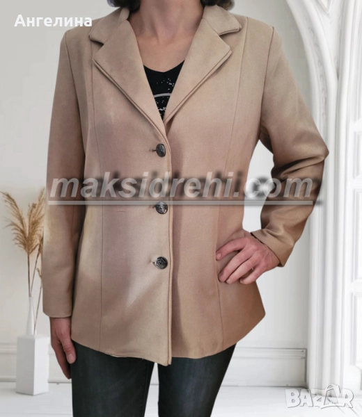 Дамско елегантно сако, изработено от висококачествен плат, имитиращ велур. Моделът е с **вталена кройка**, която подчертава силуета, и класически **ревер**, придаващ стилен и изискан вид. Сакото е с **подплата**, което осигурява комфорт и издръжливост при носене. **Закопчава се с копчета** отпред, без джобове, запазвайки изчистената линия. Дължината е **под ханша**, което го прави подходящо за съчетаване както с панталон, така и с пола или рокля.