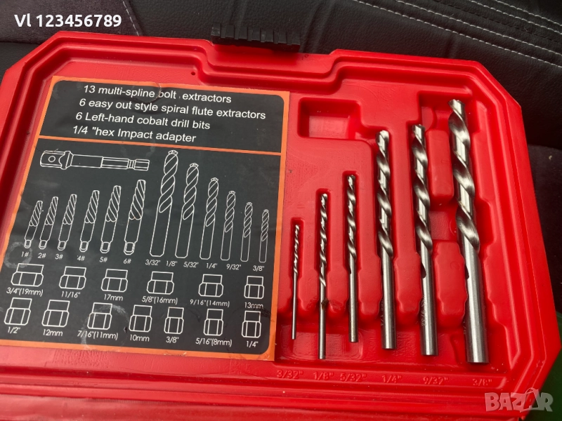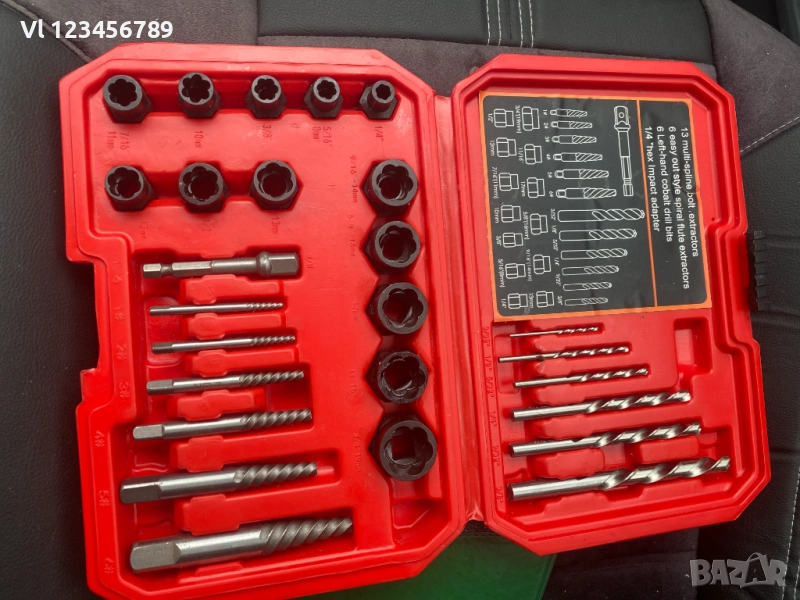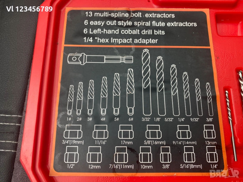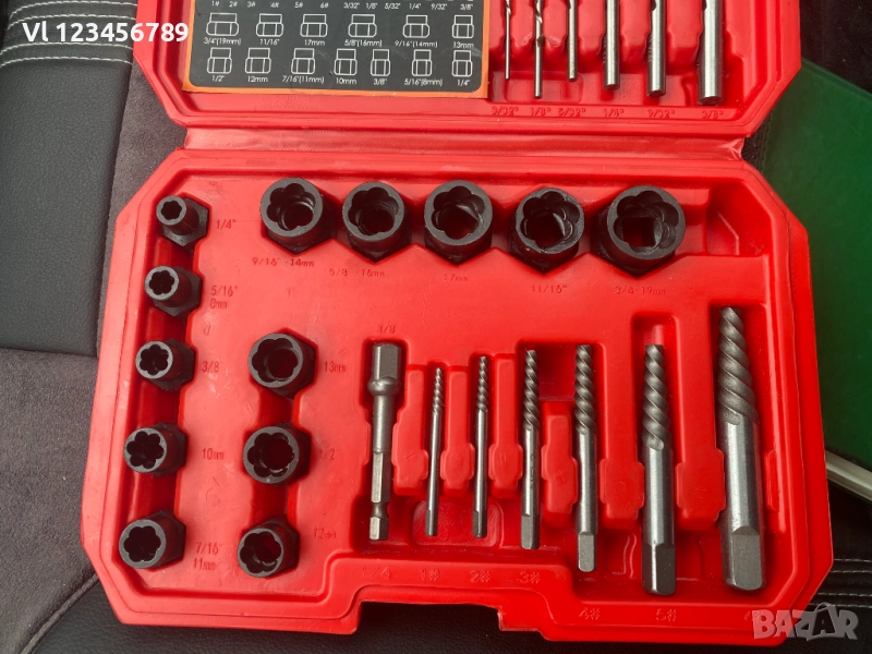 - Специализиран комплект екстрактори за разхлабване на повредени болтове и гайки с размер от 8 до 19 mm