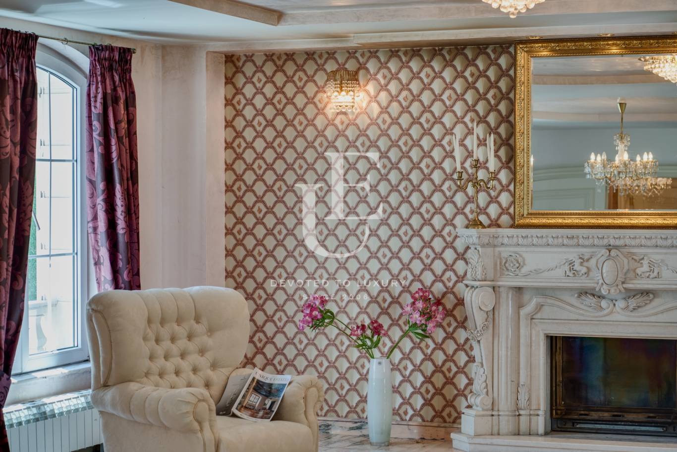 мрамор, ръчно изработена камина от варовик, кристално осветление (Bohemia и Swarovski), както и дизайнерски орнаменти, брави и контакти (Salice Paolo).