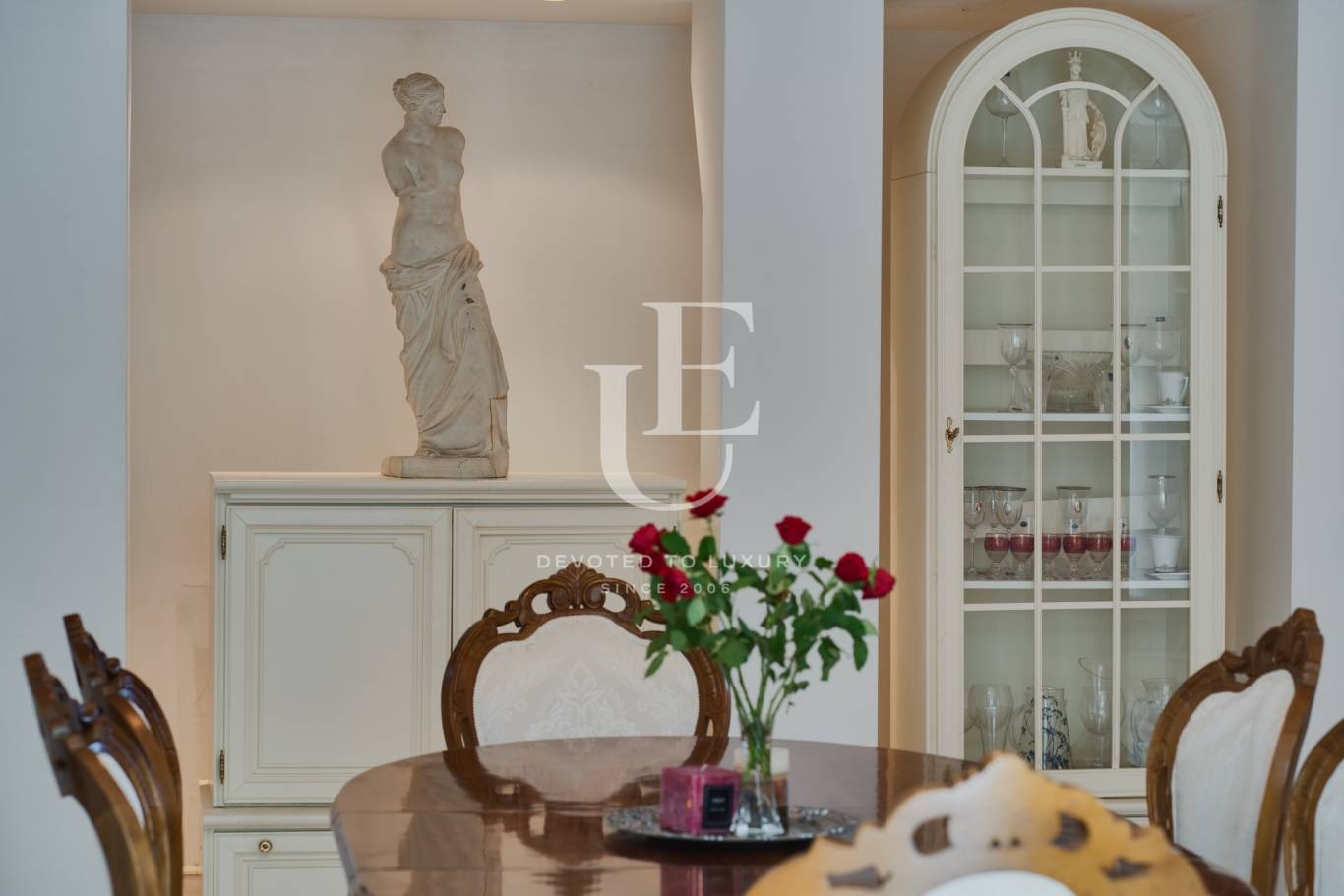 мрамор, великолепна ръчно изработена камина от варовик, кристално осветление (Bohemia и Swarovski), дизайнерски орнаменти, брави и контакти (Salice Paolo).