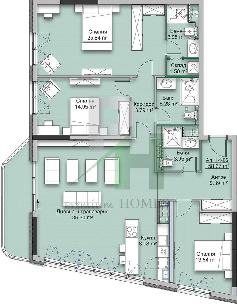 На една от най-престижните и удобни локации в София Ви очаква завършена сграда с Акт 16 съчетание на модерен дизайн, стил и функционалност. Проектирана с внимание към детайла и използване на висококачествени материали, тя предлага светли и просторни жилища с уникални панорамни гледки към града и Витоша, които се разгръщат от всяка стая. Френските прозорци подчертават усещането за пространство и осигуряват изобилие от естествена светлина. Сградата е с вентилируема фасадна обшивка от алуминиеви композитни панели ALPOLIC A2, алуминиеви профили Schüco за прозорци и врати и дизайнерска входна врата Solid по индивидуален проект. Отоплението е решено с подово отопление REHAU с допълнителна изолация, което гарантира комфорт и енергийна ефективност. За спокойствието на обитателите са осигурени контролиран достъп, жива охрана и видеонаблюдение 24/7. Сградата разполага с две напълно отделени фоайета жилищното с рецепция и зона за изчакване, офисното със самостоятелна рецепция и зона за изчакване. На партерно ниво е обособена кафетерия с директен достъп за клиенти. Това е място, където качеството на строителство, комфортът и престижът се срещат в една модерна градска среда, а всяка сутрин започва с простор, светлина и гледка, която вдъхновява. Разпределението на имота е: дневна с кухня, три спални, три бани с тоалетна, мокро помещение, тераса с гледка към Витоша.
