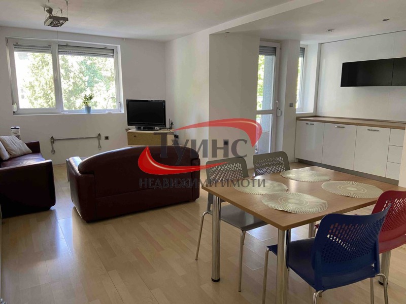 Агенция ТУИНС недвижими имоти предлага ЕКСКЛУЗИВНО под наем тристаен апартамент - 95кв.м., ТОП локация - на 2-3 мин. пешеходно разстояние от ВМИ. Жилището е на 1-ви етаж и се състои се от просторна всекидневна с трапезария и кухненски бокс, 2 спални, 2 бани и тоалетни, 2 тераси, антре. Жилището е напълно обзаведено. Супер комуникативно и тихо място за живеене.
