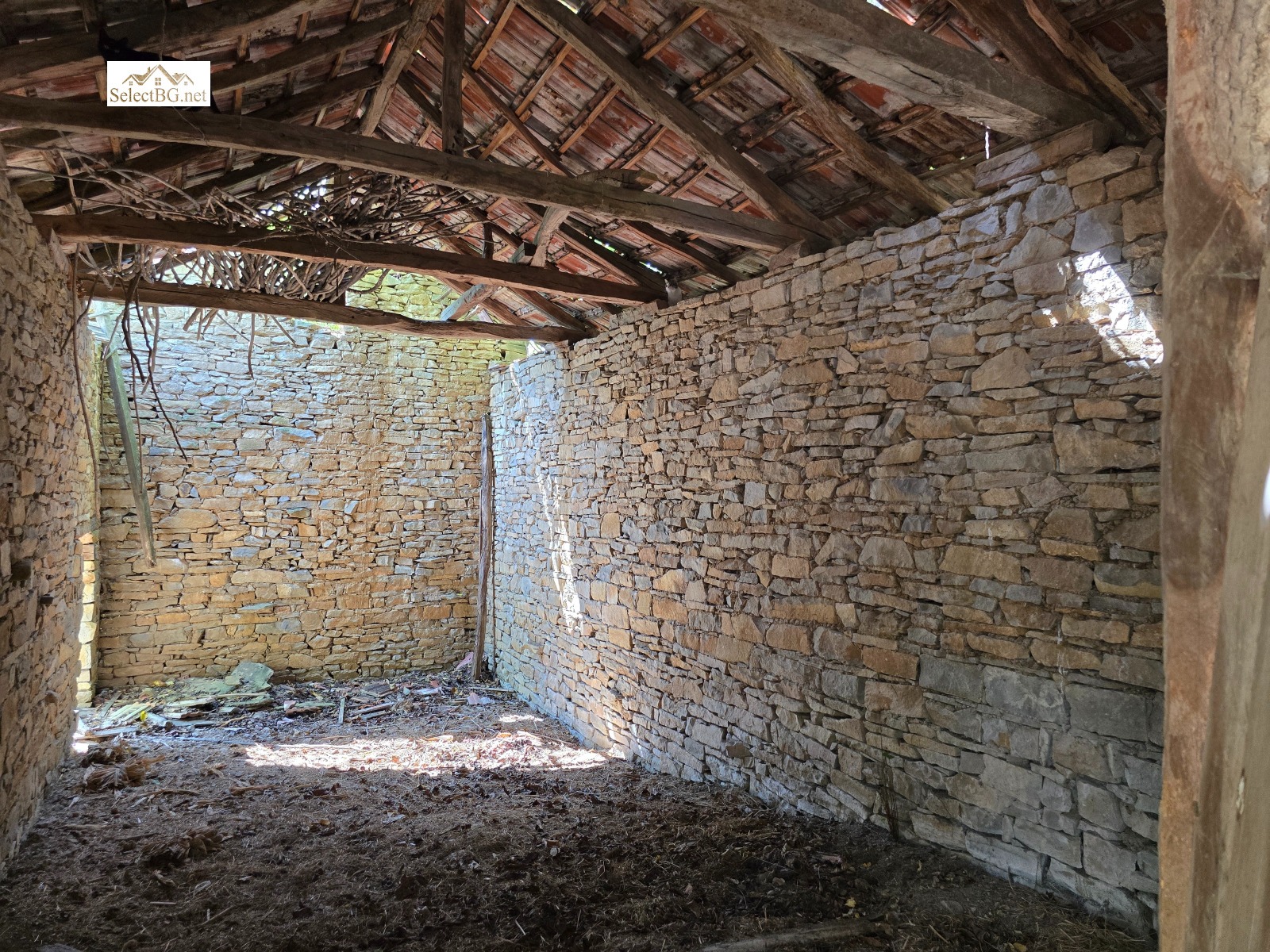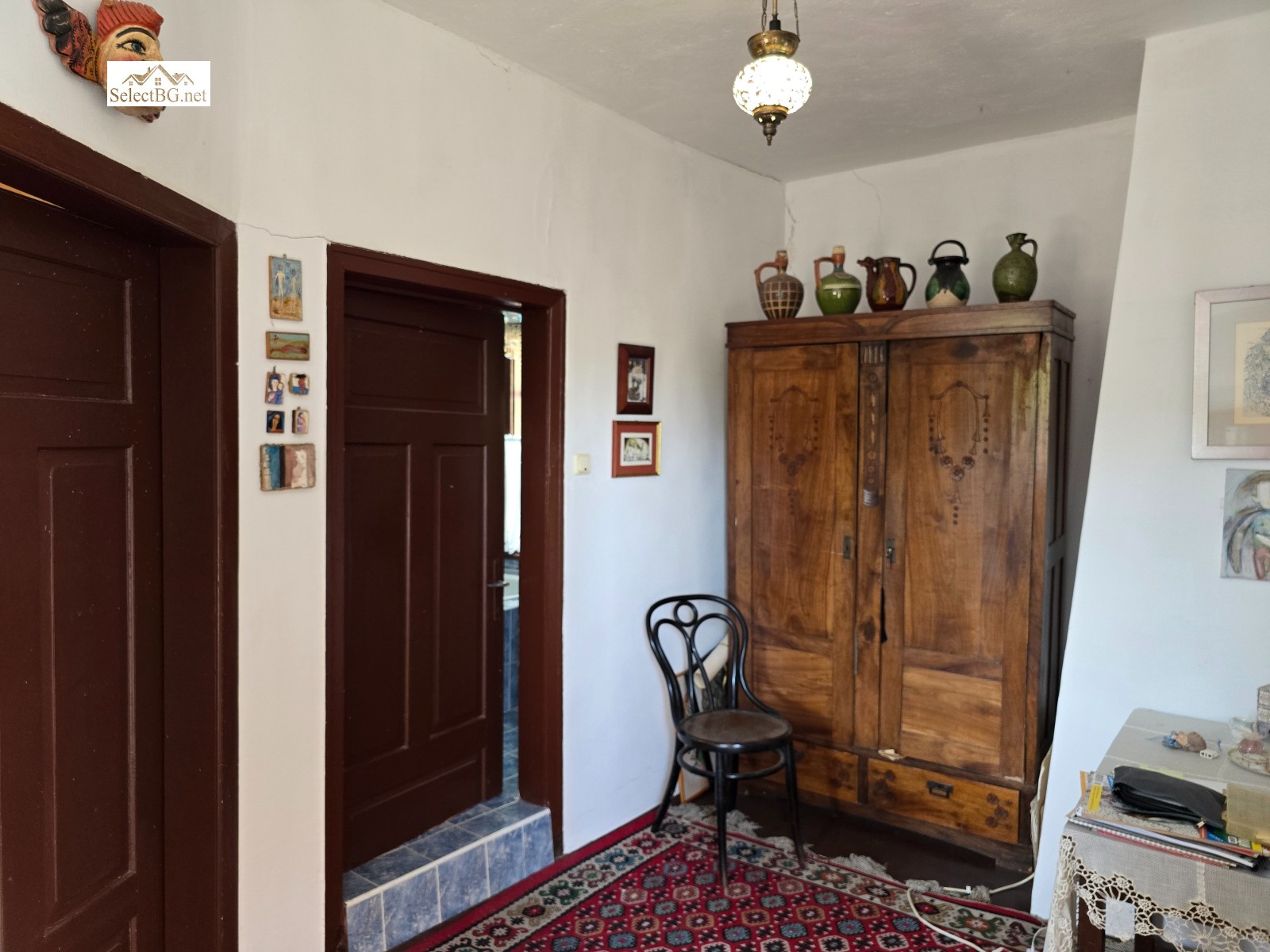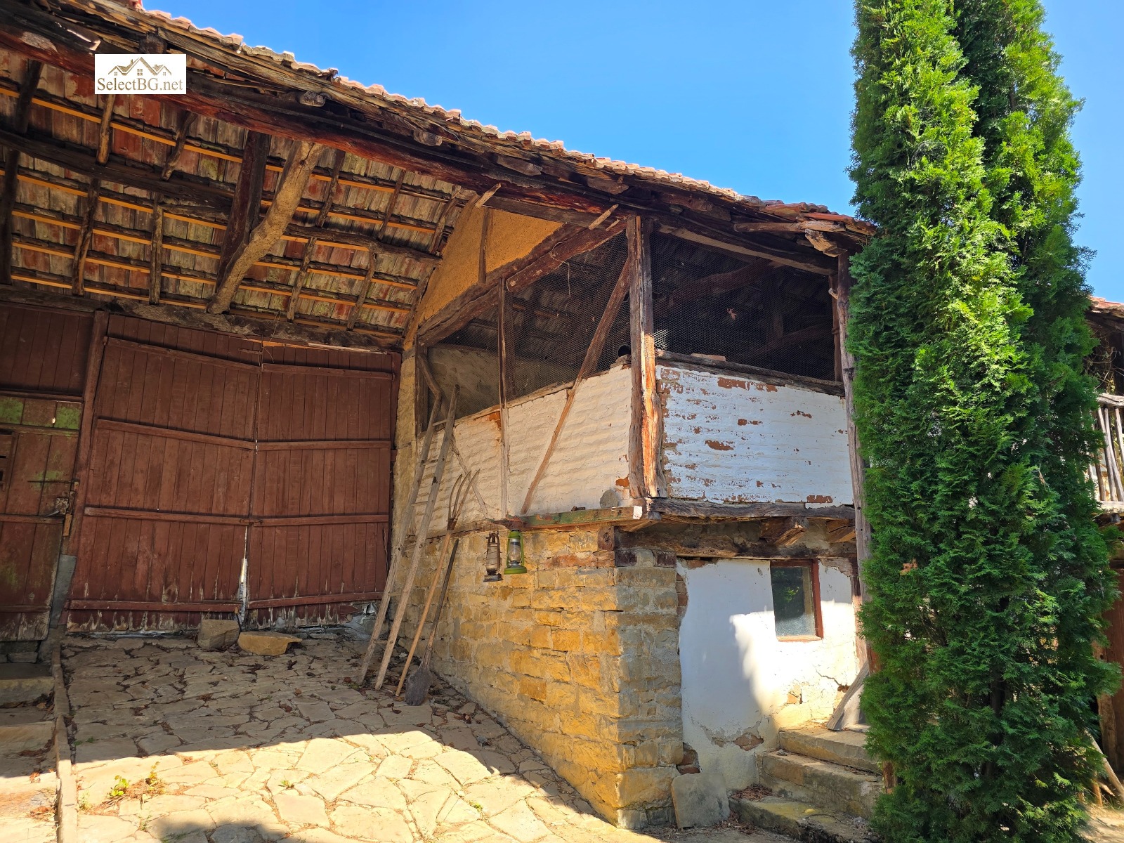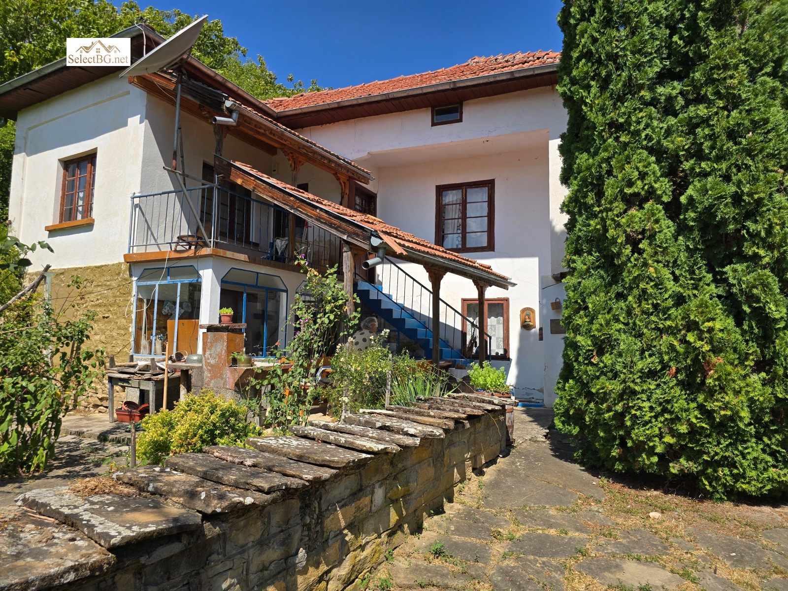 Имотът се намира на метри от площада на селото , на асфалтова улица с целогодишен достъп. Спокойно се паркира пред имота, като входът има и двойна дървена порта за достъп навътре. С влизането в имота впечатление правят високите над 10 м кипариси , които заедно с вечните дебели каменни плочи и калдаръма са акцент в предната входна част на имота. Къщата е сякаш скрита сгушена встрани, традиционна Българска двуетажна къща 110 м2 в стар стил със запазени орнаменти и редица подобрения . На приземния етаж има антре остъкление , еднообемно пространство кухня с автентично огнище и две стаи хол ( или трета спалня ) и дневна и баня с мокро помещение. По външно стълбище се стига до горния етаж, където има две спални и баня , като от коридора се излиза на тераса с хубава панорама към хълмовете отсреща. Дворът стига чак до долната улица, с площ 1 406 м2 , разделен на няколко части и в него има !6! второстепенни постройки с обща площ над 160 м2.