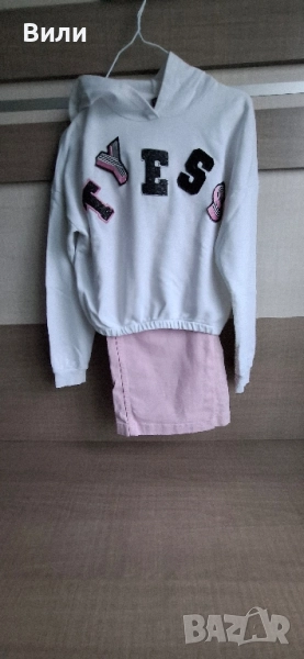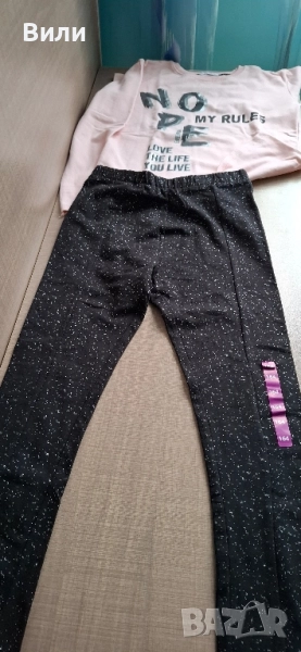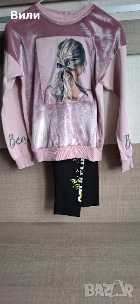 5. Комплект от клинче /164/ с бели надписи и мека, розова блуза /158/