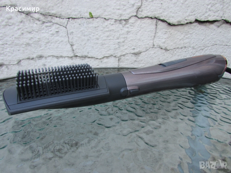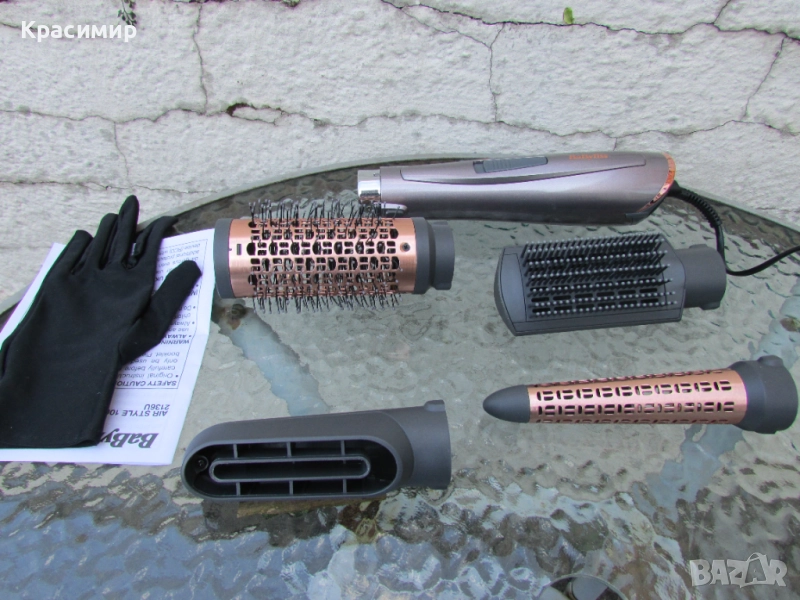 Сешоар BaByliss Air Style 1000, с 4 стилизиращи приставки за сушене, изглаждане, оформяне и къдрици. Има изсушаваща дюза - приставка за отстраняване на влагата преди стилизиране, 50 мм термо четка за обем и форма, конусовидна медна приставка за къдрене - за меки къдрици и вълни и гладка четка за сушене - изглажда косата за елегантен и блестящ завършек. Има вградена изглаждаща йонна система освобождаваща йони, контролиращи къдренето, като се постига максимален блясък, с всяка една от приставките. Има 2 настройки за горещ въздух, една за охлаждане, мощност 1000W и дължина на кабела 250 см. Сешоара е в перфектно състояние в комплект с топлоизолираща ръкавица и упътване. Купуван е от Англия, като давам накрайник за европейски стандарт към него.