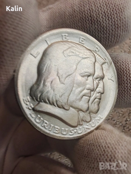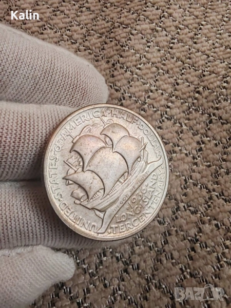 Предлагам оригинална възпоменателна монета от САЩ, сечена през 1936 г. по повод 300-годишнината от заселването на Лонг Айлънд (Long Island Tercentenary). На аверса е изобразен корабът на първите заселници, а реверсът представя профили на холандски колонист и американски индианец – символи на срещата на двете култури.