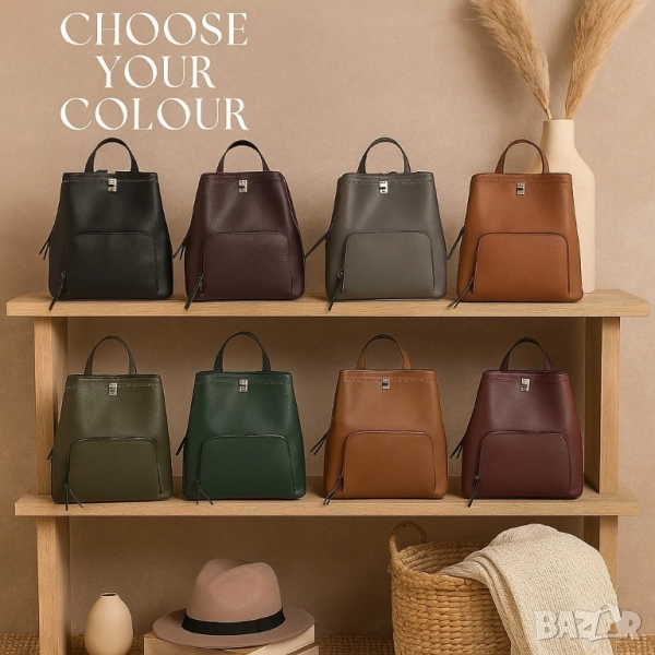 Материал: висококачествена еко кожа; Размер: средно голяма, подходяща за ежедневие; Прегради: 3 самостоятелни отделения + преден джоб с цип; Презрамки: регулируеми, удобни за носене; Дръжка: за носене в ръка; Цветове: черен, тъмно кафяв, тъмно сив, кафяв, маслинено зелен, тъмно зелен, светло кафяв, тъмно лилав.