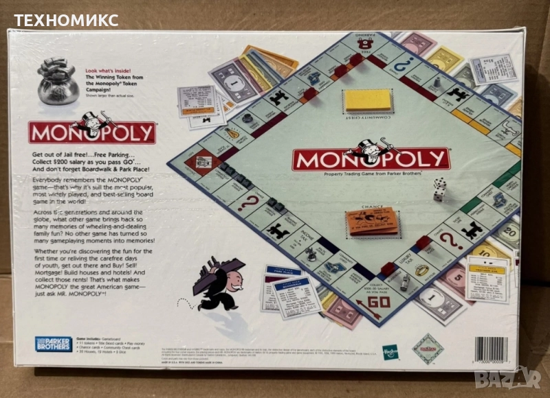 Версия: Стандартна английска Monopoly. Игрално поле: Красиво оформено с класическите полета – Mayfair, Park Lane, Chance и др. Комплектът съдържа: Игрално поле, 2 зарчета (червено и синьо), 6 класически метални пионки (автомобил, шапка, кораб и др.), Парични банкноти, Карти „Chance“ и „Community Chest“, Карти за собственост (улици, гари), Къщи и хотели. Правила за игра.