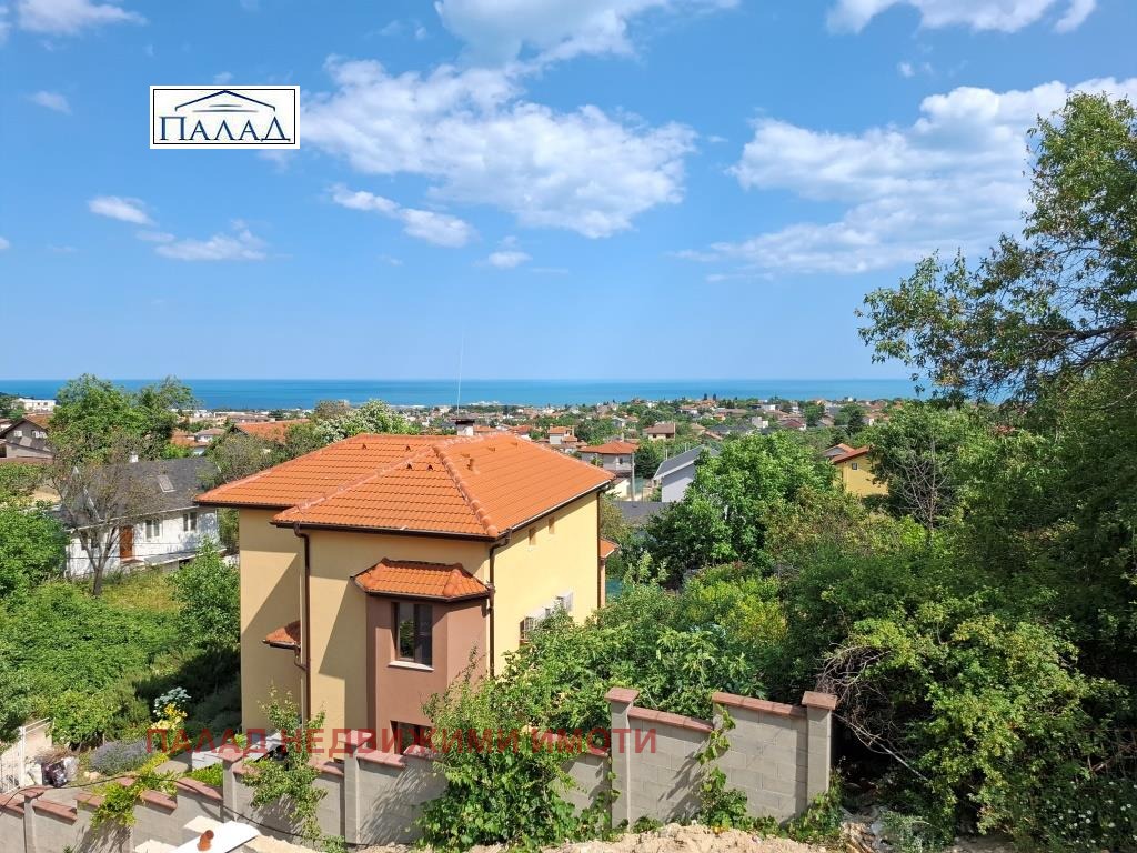 На Вашето внимание предлагаме къща с панорамна гледка в строеж. Състои се от дневен тракт 50м2, спалня и санитарен възел на първия етаж, на втория етаж - 3 спални, от които родителската спалня е 14.85 м2 със собствен санитарен възел, детската спалня е 25м2. На третия етаж се намира 90м2 покривна тераса, с панорамна гледка към морето . На партерния етаж има просторно антре, санитарен възел и 50м2 студио. Къщата е с благоприятното югозападно изложение. Обща РЗП 360м2. Площта на терена е 500м2, с денивелация, терасиран и подреден , като от дневния тракт има излаз към обособен двор.
