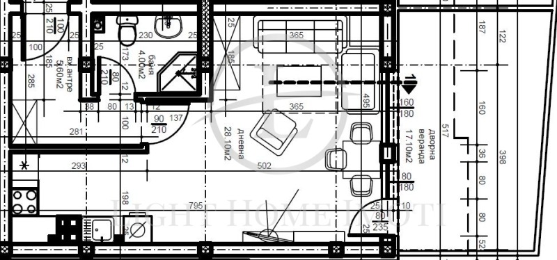 -Разпределение- Хол с кухня и кът за спане, баня с тоалетна, входно антре, склад и дворна веранда.