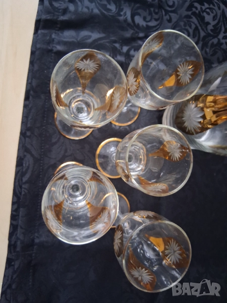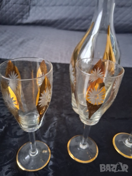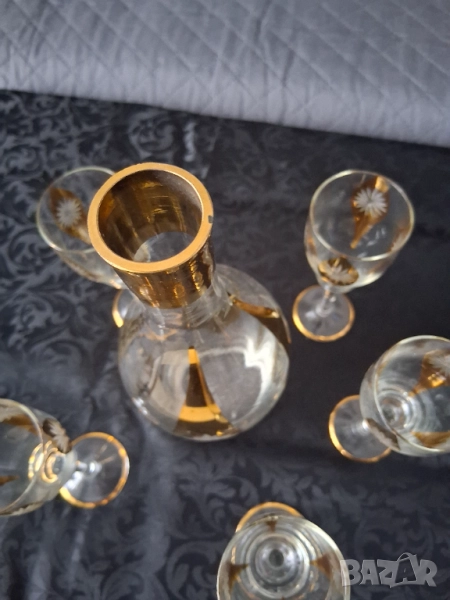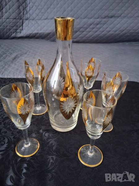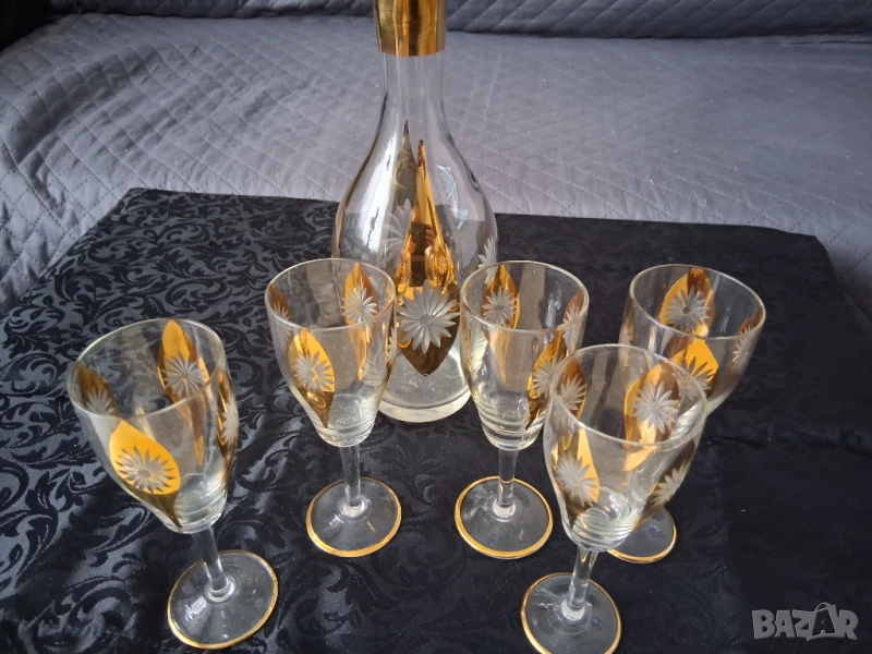 Непълен сервиз с позлата и гравюра ,липсва тапата на шишето и една чашка