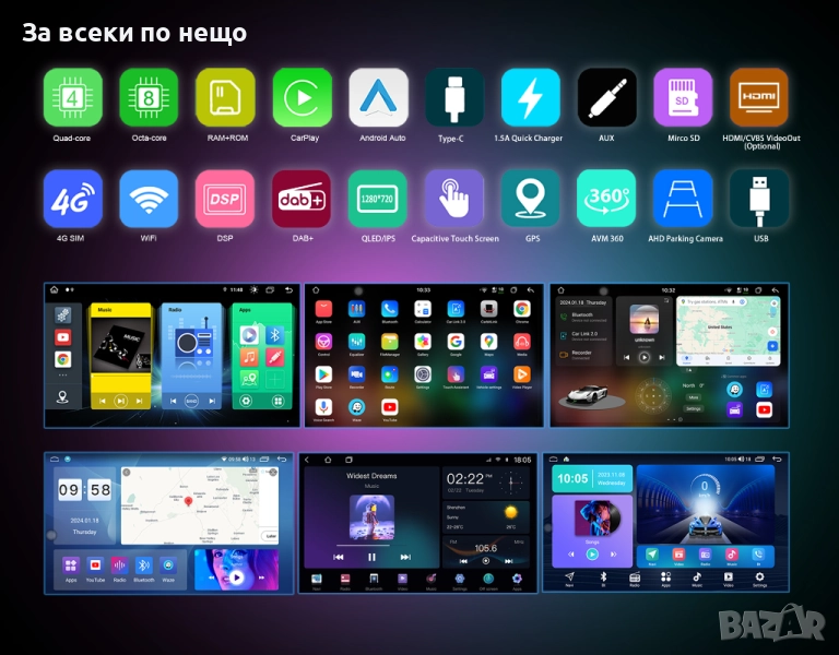 Поддържа камера за заден ход, управление от волана (CANBUS) и възпроизвеждане на мултимедия от външни носители.