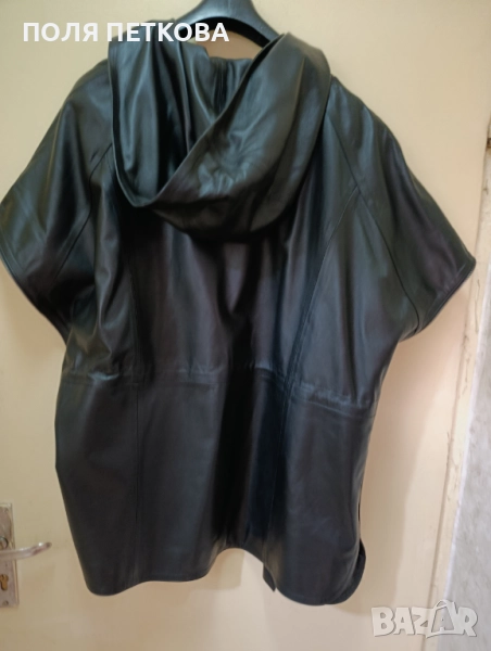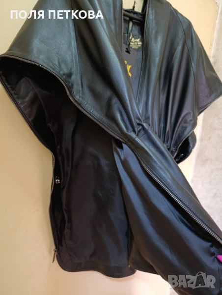 Яке дизайнерски модел тип наметка уникален модел от двете страни е с ципове които могат да се свалят до долу може да се носи и като прав модел и с връзки отвътре които втаряват и набират.Като номер три пъти XL става и за по-малък номер Чисто ново е естествена кожа гарантирано