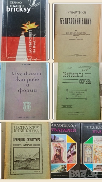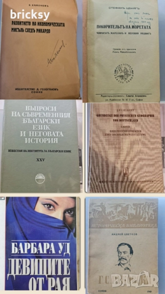 В обявата са включени антикварни, научни, художествени и чуждоезични книги, издания от 1910 до 2018 г., част от които рядко се срещат и поотделно се предлагат на значително по-висока цена. Състояние: много добро до отлично (отбелязано е, ако има забележка) Тематика: класика, история, география, езикознание, мемоари, пътеписи. Езици: български, немски, руски, английски, гръцки. Избирате 5 книги по Ваш избор от списъка и снимките – цена: 10 евро. Лично предаване за София или изпращане по Еконт. Подходящо за колекционери и сериозни читатели. Цената е крайна за 5 книги. Пишете кои заглавия сте избрали – отговарям бързо.