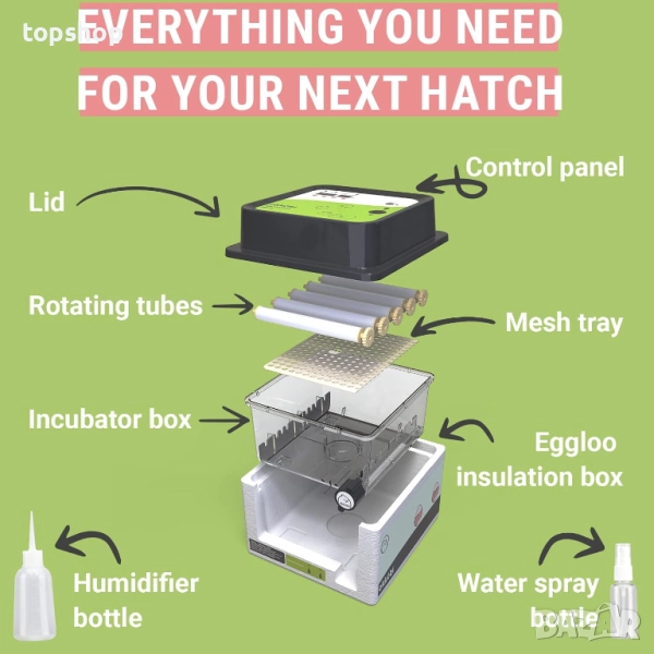 * : Нормалният процент на излюпване е между 55% и 75%, но това може да варира поради голямо разнообразие от фактори на околната среда и биологични фактори. ** : Когато разопаковате инкубатора, не изхвърляйте изолационната пяна, защото можете да използвате тази пяна "Eggloo" в студено време, за да поддържате яйцата си топли!