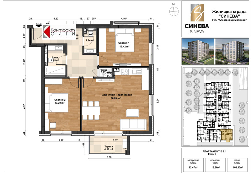 Контракт Сити ООД продава тристаен апартамент със изложение юг/изток на втори жилищен етаж в новострояща се сграда в Младост 4, срещу Декатлон. Очаква се Разрешение за ползване до м. декември 2026г. Сградата се изпълнява с висококачествени материали, изолация от каменна вата 12 см и окачена фасада, отопление на газ с поставено индивидуално газово котле и радиатори във всеки от апартаментие. Изпълнено кабеляване и отръбяване за климатици, висок клас апартаментна блиндирана врата и поставени интериорни врати на реномиран български производител. Шесткамерна дограма с троен стъклопакет, френски прозорци в жилищата. Жилището се състои от просторна ъглова дневна с кухненски бокс, две спални, един балкон, баня с тоалетна, отделна тоалетна и склад в жилището. В сутерена има избор на паркоместа. Всички налични апартаменти в сградата, както и всички актуални предложения на Контракт Сити: https://contract-city.com/bg/ и тел. 0886 600 601