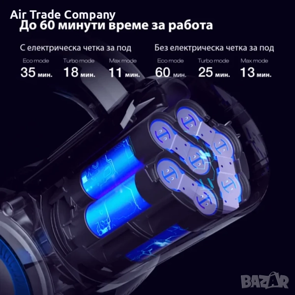 Безжичната вертикална прахосмукачка JIMMY H8 Upgraded е оборудвана със сменяема батерия с интелигентна система за управление на енергията. Комплектът от 7 2500mAh литиеви батерии му осигурява автономност до 60 минути.
