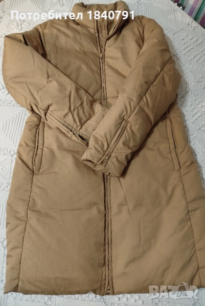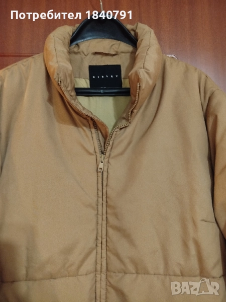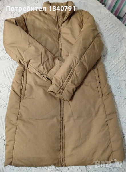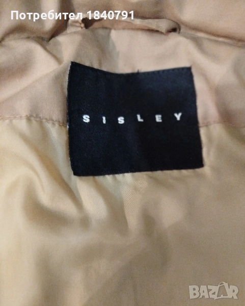 SISLEY тъмно жълто/бежово яке. Дълго, зимно. Ципове на джобовете и на ръкавите (долу), както и дълъг цип от горе до долу. Всички ципове са здрави и работят.