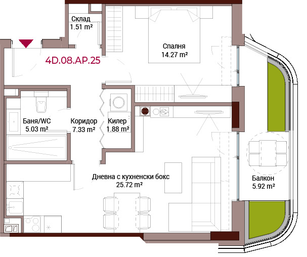 Уютен апартамент 4D.08.25 в иновативен жилищен комплекс Vitosha Art, проектиран от международни архитектурни студиа (Benoy и ML Studio Лондон).