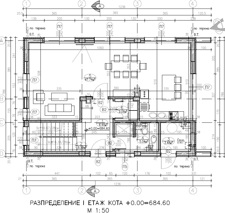 - на първо ниво - дневна, баня с тоалетна, перално помещение, техническо помещение и веранда.