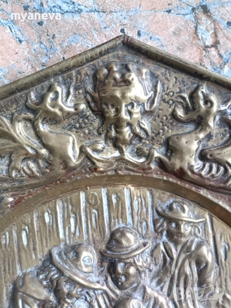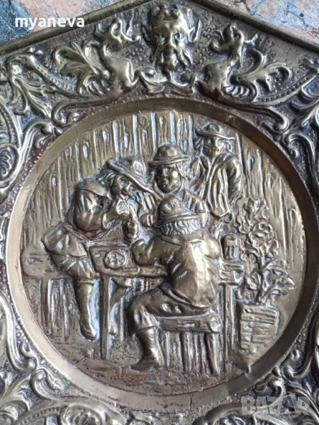 Vintage, метална, осмоъгълна чиния, пано в холандски или фламандски стил. Централният релеф изобразява