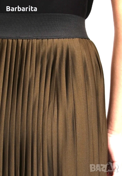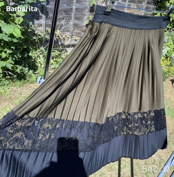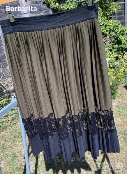 Маслено зелена плисирана пола с дантелен панел.Размер 36/S. Няма забележки. Дължина 65 см.Колана е с ластик.