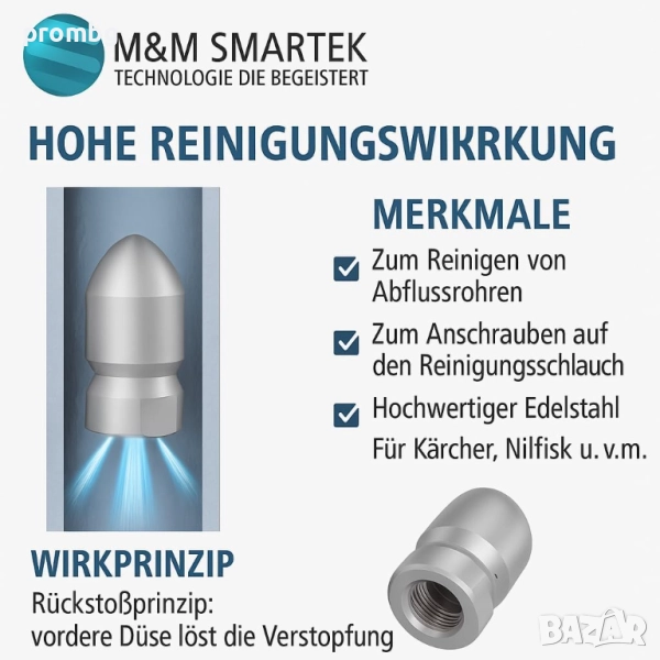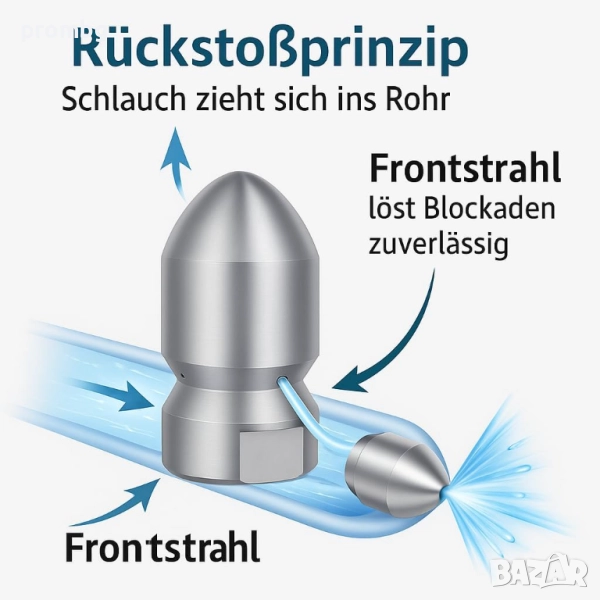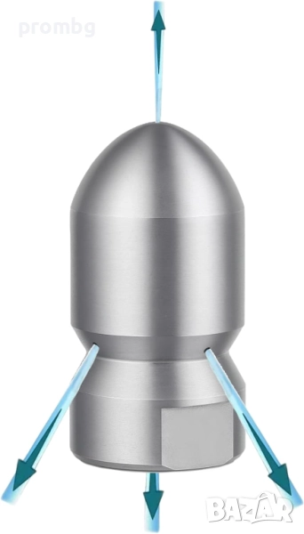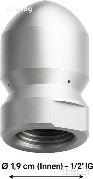 дюза за отпушване на канали, тръби, Германия. Материал: здрава, неръждаема стомана. Вътрешна резба 1/2 инча. Области на приложение: Почистване на канализационни тръби, дренажни тръби и др. Външен диаметър 30 мм.