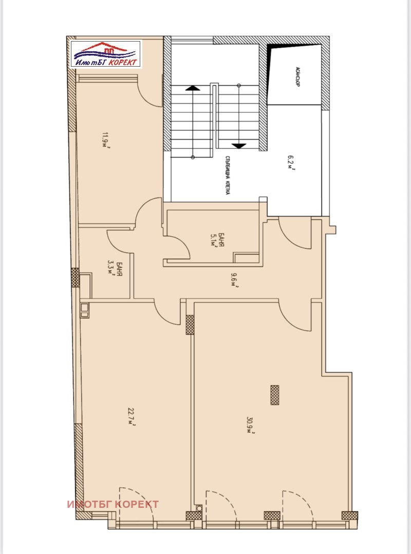 Разпределение: Входно антре, три просторни стаи, две бани с тоалетни и тераса.