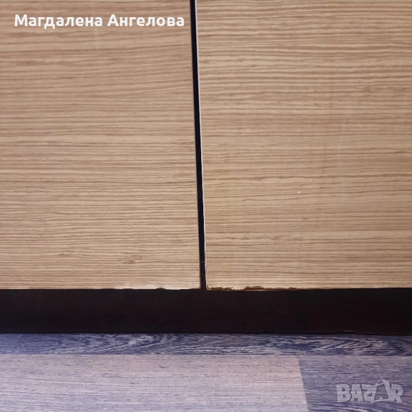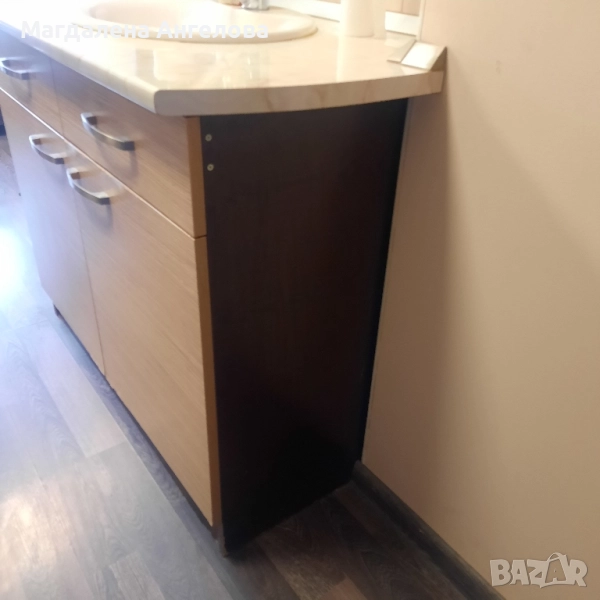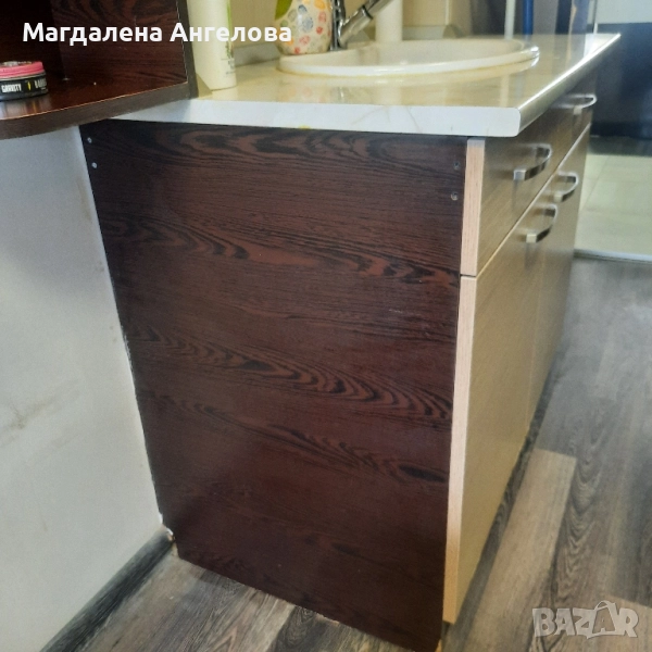 дървен шкаф - горна и долна част, в допълнение с мивка и етажерка отстрани.